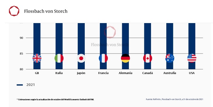 Esta "sobrecompensación" de los hogares estadounidenses se ha traducido hasta ahora en una fuerte y sostenida demanda de los consumidores, que se refleja en un récord de ventas minoristas en Estados Unidos. Es probable que la economía estadounidense pueda aprovechar este impulso en el nuevo año. El Fondo Monetario Internacional (FMI) estima que la economía estadounidense podría crecer otro 5% el próximo año. Así, la producción económica real de EE.UU. en 2022 estaría ya un ocho por ciento por