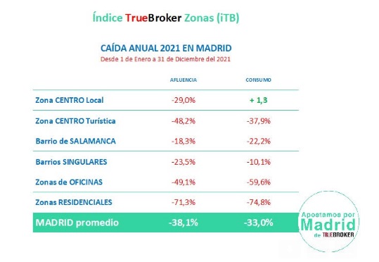 Solo una zona de Madrid, de las 6 en el iTB tiene dividido tipológicamente el análisis de la ciudad, la Zona Centro Local, tuvo un consumo anual con rebote positivo, pero inapreciable de tan solo un (+1,3%) con respecto al año anterior al Covid. A ello se añade el hecho de que 2019 no fue un año especialmente bueno para el comercio.
