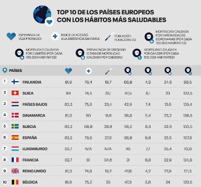 El mejor país para vivir de forma saludable, sin embargo, es Finlandia, donde el tiempo dedicado a actividades físicas es alto y las tasas de mortalidad causadas por diabetes y enfermedades cardíacas son bajas. Quizás no sea una coincidencia que el nivel de felicidad en este país nórdico sea el más alto de todos los países del estudio, aunque su esperanza de vida sea ligeramente inferior a la de Suiza y Suecia.