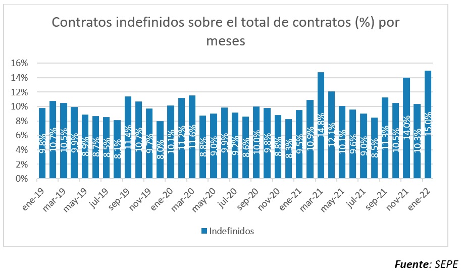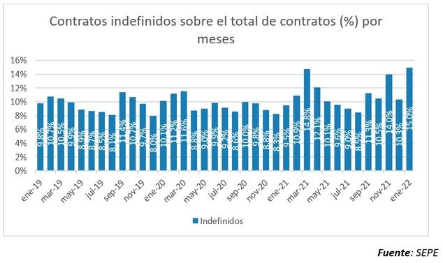 Aunque haya una desproporción tan grande entre ambos tipos de contratos, lo cierto es que ese 15 % de indefinidos es la tasa más alta registrada hasta ahora y supone cinco puntos porcentuales más que los meses de enero de los tres años precedentes.